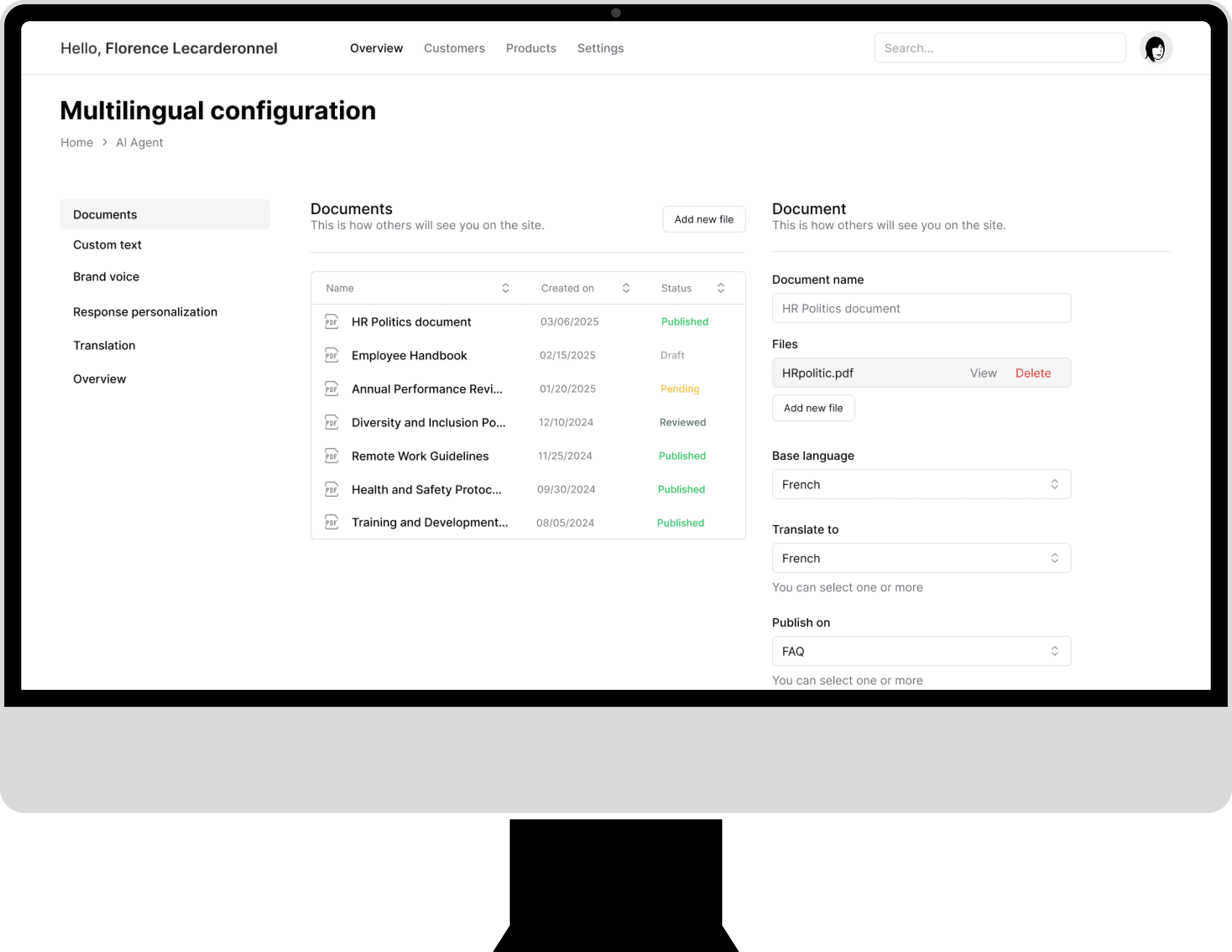 Invitez ou confirmer de nouveaux utilisateurs, personnalisez et traduisez les documents, accédez à leurs rapports d’usage, et discutez avec eux depuis votre espace dédié.